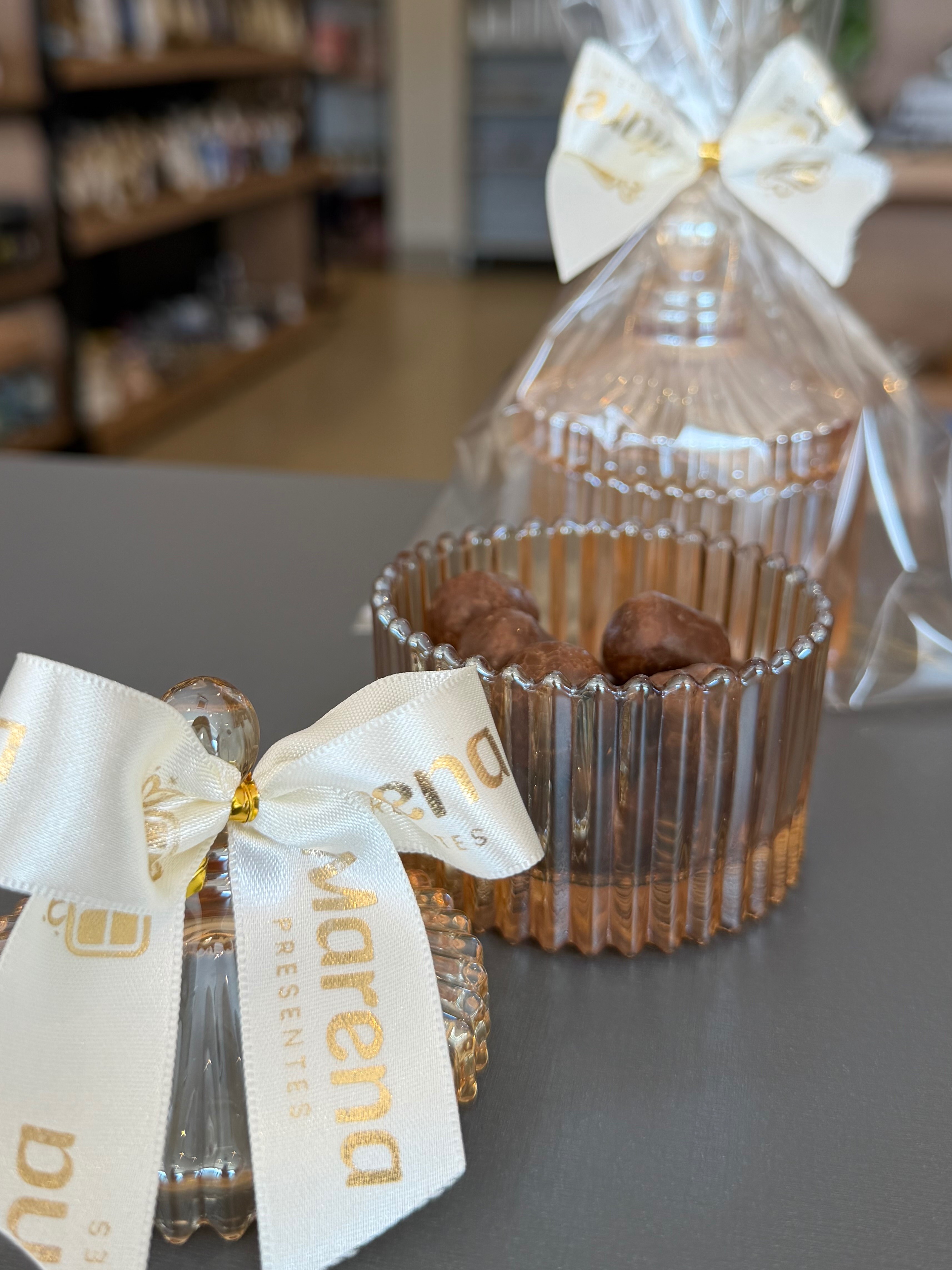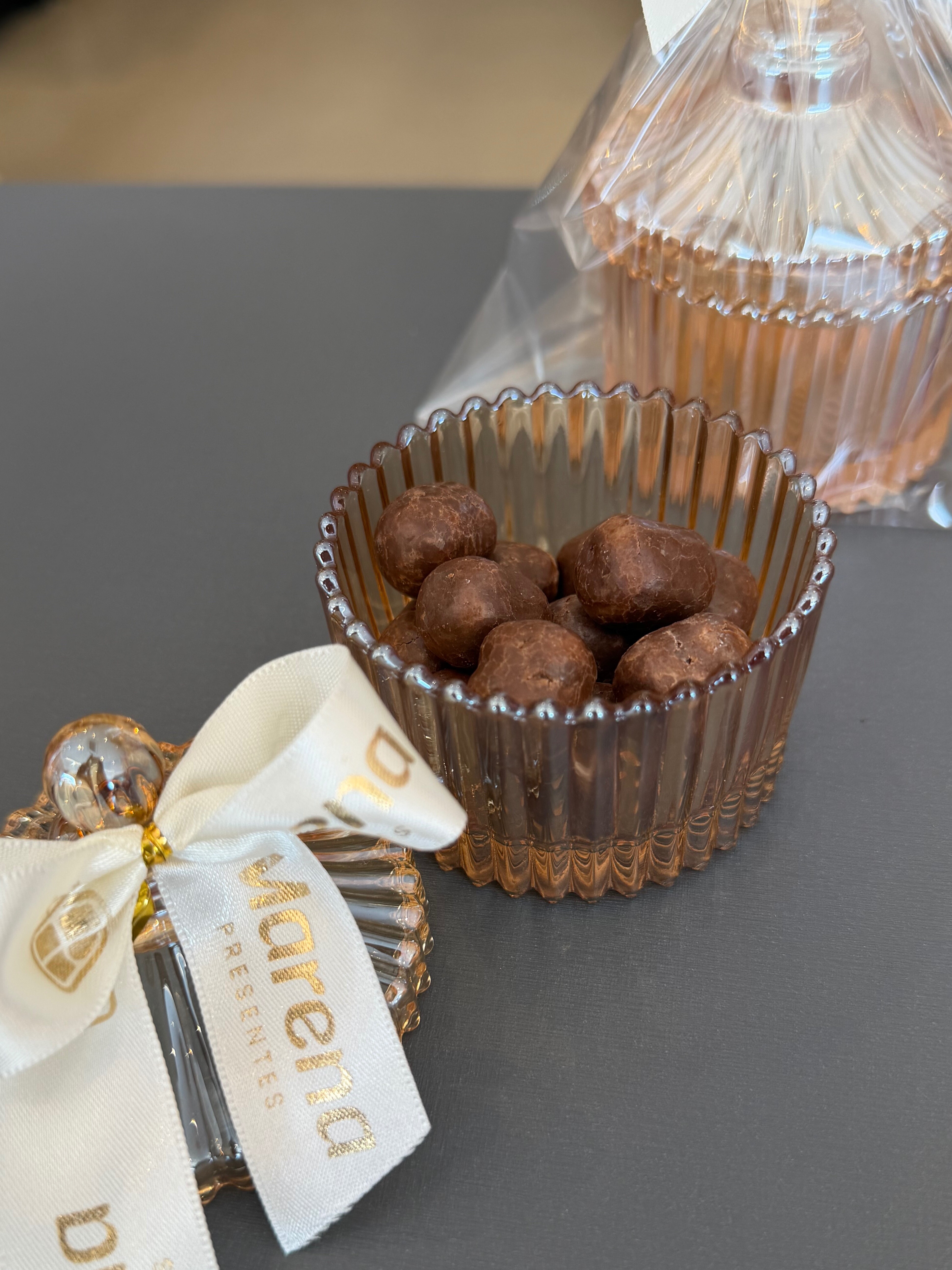 Mini bombonier em vidro com drágeas de chocolate — charmosa e perfeita para presentear.